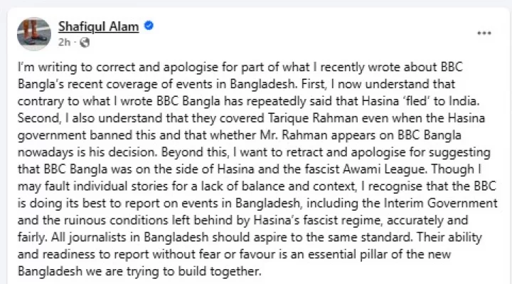 বিবিসি বাংলাকে নিয়ে করা মন্তব্যের জন্য ক্ষমা চেয়েছেন প্রধান উপদেষ্টার প্রেস সচিব শফিকুল আলম। তিনি বলেছেন, ‘বিবিসি বাংলার সংবাদ নিয়ে আমার সাম্প্রতিক বক্তব্য সংশোধন করতে চাই।’